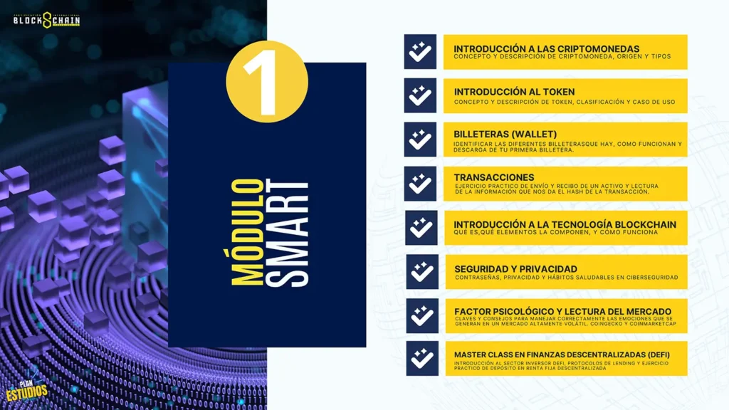 Aprenderás la base y el conocimiento de la tecnología Blockchain para poder avanzar en los siguientes módulos y saldrás con competencias claras en operativa Defi y Blockchain.